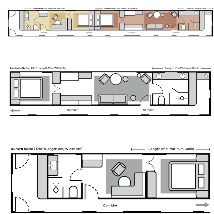 Both the Australis Suite and Aurora Suite offer expansive space with a separate bedroom featuring a custom-sized bed. The Australis Suite is three times the size of a Platinum cabin, while the Aurora Suite offers double the space.