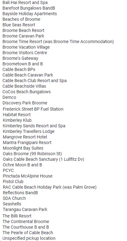 Broome Hotel Transfer Service ( Please advise your hotel name/address when make a booking) at 12:30pm pick up