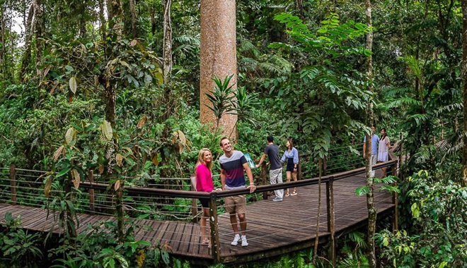 Red Peak: Descend through the canopy to explore one of the most ancient pockets of rainforest on Earth, where unique plants and animals have survived the forces of nature and time. This is the home of lush fern gardens, climbing palms, rare butterflies, birds and imposing rainforest giants, all of which are in constant competition for life-giving light. Exploring the rainforest at Red Peak is an experience not to be missed, so allow yourself approximately 20 minutes to encounter, discover and immerse yourself in this fascinating living museum.