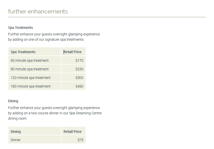 Designed for pure relaxation, our premium glamping experience is nestled in natural surrounds with private decks, ensuite bathrooms, king beds and bespoke elements inspired by our environment. Overnight Glamping is inclusive of all of site bathing across both our Bath House and Spa Dreaming Centre, as well as a signature wellness experience. Guests can enjoy a breakfast buffet served in Spa Dreaming Centre dining room. Guests can further, enhance their overnight glamping experience by adding spa treatments and an evening dining option to their stay.