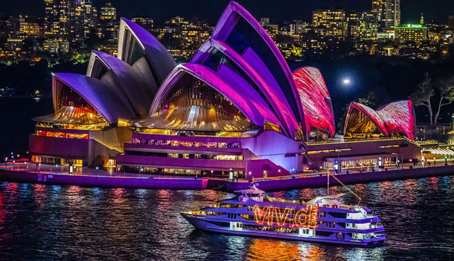 Experience the vibrant Vivid Sydney festival in 2025, lighting up the city with international artists, cutting-edge technology, and music. Iconic landmarks like the Harbour Bridge and Sydney Opera House transform with colours and music, while the entire city boasts light installations and interactive displays. Don’t miss this lively winter event, and consider our most popular Sightseeing cruise after Dark!