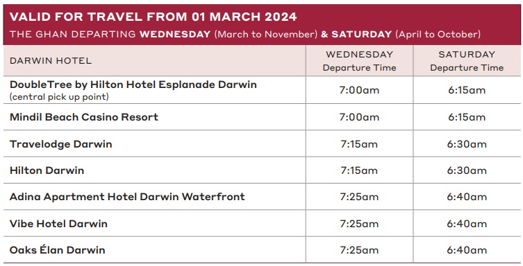 For Gold Service guests who are not staying at one of our preferred pick up locations, please make your own way to the Darwin Convention Centre, located at 10 Stokes Hill Road, Darwin City for check in.