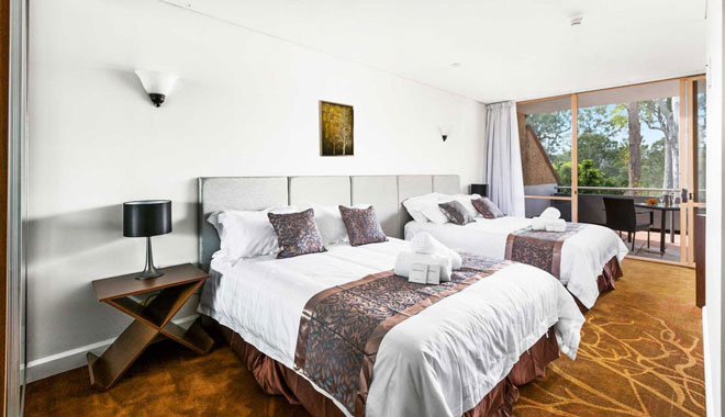 Our Queen Twin Rooms feature a private balcony and two luxurious queen beds. All rooms are equipped with a 43-inch TV, warm natural earth tones, and soft textures to make you feel at home. Perfect for families, golf "stay and play" packages, or business travelers. All Queen Twin Rooms come with our premium room facilities.