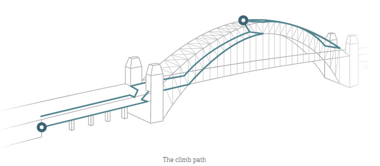 THE JOURNEY: Latching on in the Climb Base below the Bradfield Highway, you will walk on catwalks directly over Sydney Harbour past the South-East Pylon, until you meet the base of the Bridge’s lower arch on the Opera House side. Here you will commence your ascent as you rise to the peak of the lower arch. At this point, you will break through to the upper arch by taking a staircase to the Summit. After a Summit celebration with your group, you cross the spine of the Bridge to the Darling Harbour side to make your descent to our Climb Base.