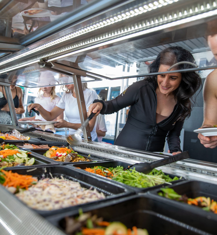 Reef Magic: The platform offers a delicious buffet lunch with a mix of Japanese and Western cuisine, including grilled steaks, Japanese sushi, fresh shrimp, curry, pasta, salads, marinated grilled drumsticks, and more.
