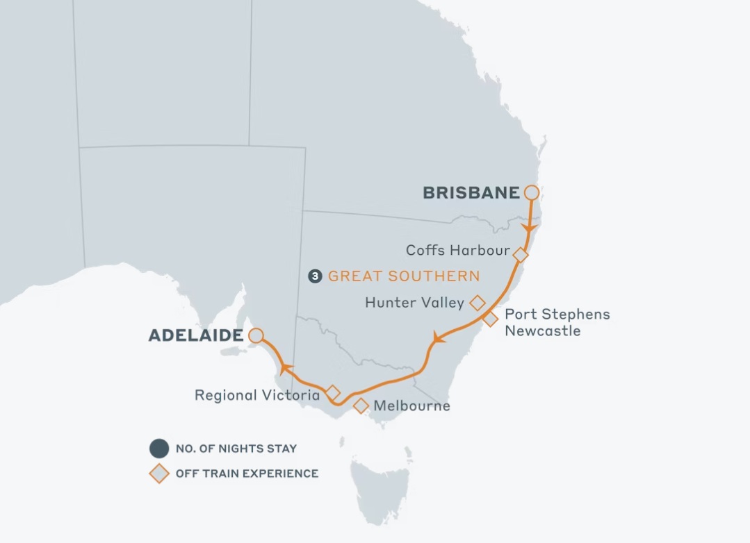 Embark on an unforgettable four-day, three-night rail journey from Brisbane to Adelaide aboard the Great Southern, traversing some of Australia’s most breathtaking coastal and inland landscapes. Savour creative, regionally inspired menus showcasing premium local produce and wines, as you journey through northern New South Wales, regional Victoria, and South Australia, culminating in the vibrant city of Adelaide.