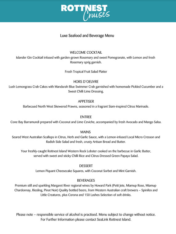 Once on the island, you’ll have some free time to explore the village settlement and visit local stores before boarding the Rottnest Cruises vessel for a 4-hour, 7-course deluxe seafood banquet. Be greeted by friendly staff with a Lychee Blossom Gin Cocktail, tasty canapés, a selection of premium local wines, and a range of beers.