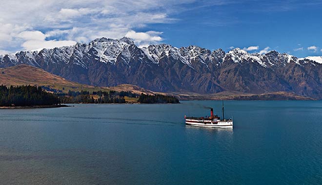 中午乘坐已 111 年百年历史的TSS Earnslaw 古典蒸汽船【约3.5小时】游览瓦卡蒂普湖惊嘆于山景湖泊的不断变化!