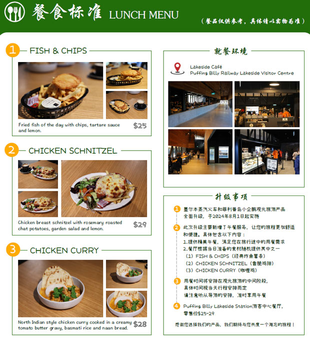 市区酒店迎接出发,开始今日墨尔本经典野趣游,乘坐普芬比利火车穿越森林,傍晚在企鹅岛见证呆萌小企鹅归巢!两大景区一次搞定!出发前往丹顿农山脉(Dandenong Ranges)。行程第一站是帕芬.比利蒸汽小火车(Puffing Billy Railway)。帕芬.比利蒸汽小火车是澳大利亚历史最古老的蒸汽火车之一,位于墨尔本东部42 公里处。游客可以在此乘坐小火车,穿梭在翠绿的丹迪农山脉,体验澳大利亚的自然生态,行程含Belgrave 至 Lakeside单程火车票,1小时。