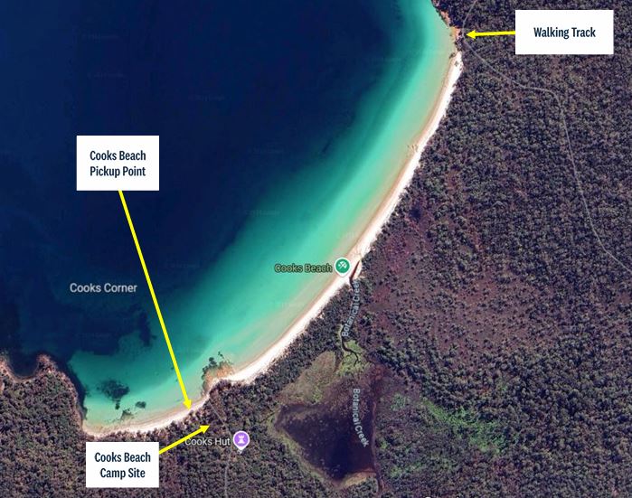 Cooks Beach 是菲欣纳半岛(Freycinet Peninsula)长程步道旅客常用的露营地,我们每日提供 Cooks Beach 的接驳服务。此处营位数量少、先到先得,无法预约,无法保证一定有空位。