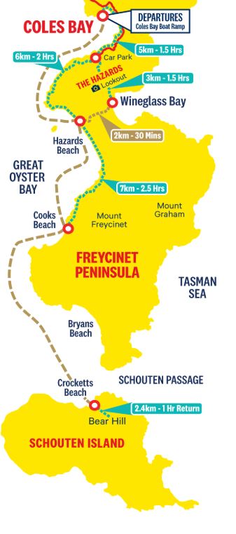 Freycinet Aqua Express 提供每日多班次的水上渡轮服务(Freycinet Aqua Taxi),可单趟或往返前往 Hazards Beach,也提供每日前往 Cooks Beach 的接驳,并可依需求安排前往 Schouten Island 的接送服务。