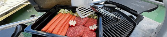 薄切牛肉香肠与肋眼牛排薄片, 白色高顶面包捲与奶油份量, 生洋葱片, 混合生菜叶, 番茄片, 切达起司片, 烧烤酱、番茄酱及蒜泥蛋黄酱, 一次性甘蔗餐盘、木制餐具、餐巾纸与环保水杯