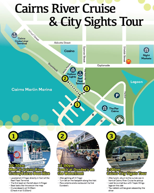 在这场全天导览旅程中,体验凯恩斯最精华的魅力!行程结合 三一河口 (Trinity Inlet) 晚餐帆船、水岸午餐、圣莫妮卡大教堂、凯恩斯博物馆、植物园、英式下午茶、雨林观景台,以及棕榈湾的滨海漫步。这是一趟融合宁静游船、城市文化、雨林美景与海滨风光的完美行程。今天可睡到自然醒, 行程中午才开始 !