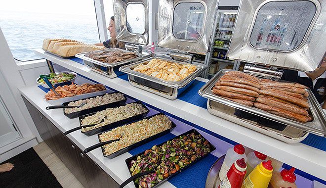 午餐供应丰盛的澳大利亚BBQ自助餐和新鲜的沙拉吧,在回程中,锁有宾客享受免费的葡萄酒、奶酪、 饼干和热带水果拼盘,同时欣赏现场音乐。在凯恩斯没有比进化号大堡礁一日游更好的方式来体验大堡礁的奇观了。