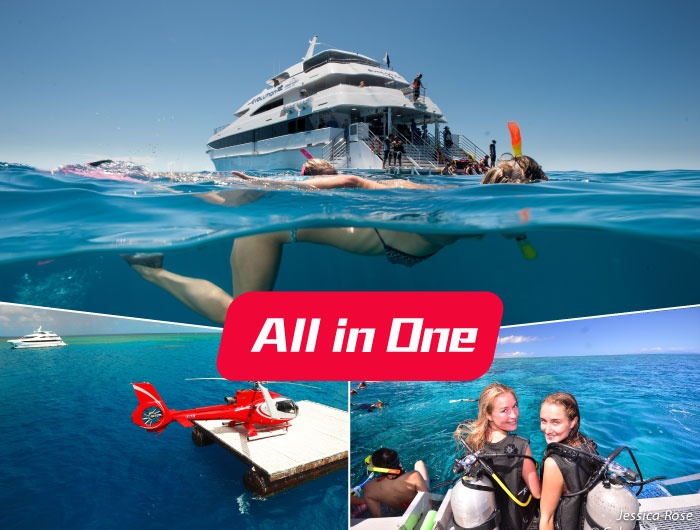 凯恩斯外海大堡礁豪华游船超值一日游(游船+浮潜+直升机观光+可选深潜),超值直升机全方位俯瞰大堡礁组合浮潜特色深潜!年轻有活力的客人的首选,上天下海同类产品最便宜的行程,全程海上游艇(凯恩斯出发),快速流线游艇,在大堡礁上的5个小时内,玩乐时间特长, 停留两个不同礁群,让你尽情探索海底奥妙!