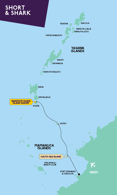 这短暂而令人兴奋的旅行涵盖了两个美妙的岛屿。在南海岛,充分利用免费提供的水上运动设备,或预订一堂自由加购的潜水课程。第二天,前往库阿塔岛(Kuata Resort) 的 光脚库阿塔度假村(Barefoot Kuata Resort),近距离接触珊瑚礁中鲨鱼的自然环境。别担心,它们是相当温驯的斐济鲨鱼,您将在整个过程中有导游陪同。在这个位于亚萨瓦群岛底部的风景如画的度假村过夜,四周被令人印象深刻的火山峰所环绕。不妨努力爬到山顶观看日落,这是值得的!