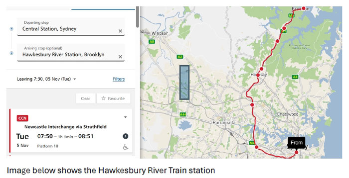 行程安排:悉尼中央车站(Central Station)至霍克斯伯里河站(Hawkesbury River Station)