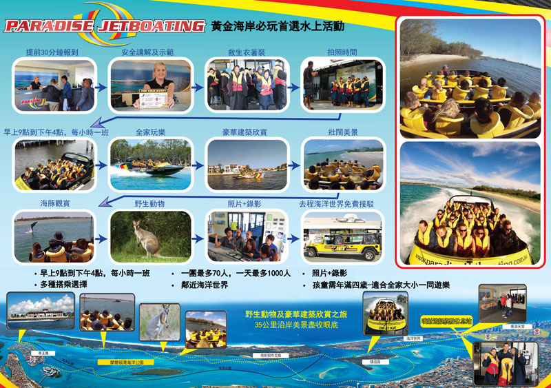 60钟:从黄金海岸冲浪者天堂海滨码头出发 → 海洋世界(SeaWorld) → 环绕小沙岛-断浪岛(WaveBreak Isand) → 富人豪宅-帝王岛(Sovereign Island) → Mangrove Channels → Brown Island → 澳洲第三大大沙岛-南斯德布鲁克岛(South Stradbroke Island) → 途经凡赛斯六星级皇宫酒店(Palazzo Versace) → 返回