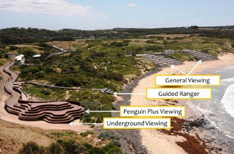 接近黃昏時會安排靜靜地在觀看台等大量藍企鵝從海灘登陸排隊走回巢, 期間不能拍攝及禁止放聲說話以免藍企鵝受驚。 能親眼由遠處看見藍企鵝從凶湧的海浪中上岸, 再近距離看見牠們例隊一搖一擺地按著本能返回自己的巢穴, 樣子非常可愛! 基地內的地下觀賞窗及遊客中心亦能更了解藍企鵝的習性。非常值得親身體驗!