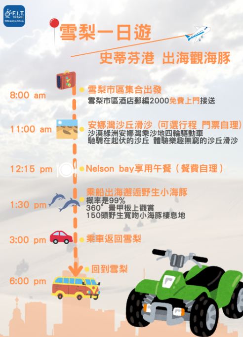上午8:00am(具体请以短信通知为准)中文司导上门接送【悉尼CBD酒店和民宿(邮编2000)免费上门接,若无法确定您的地址是否在接送范围内,可提前联系客服确认。若您的地址不在接送范围内,请自行前往以下位址集合Furama Darling Harbour 唐人街假日酒店(68 Harbour St,Haymarket NSW 2000)】,随后开始当天的行程。首先前往史蒂芬港(Port Stephens)。史蒂芬港位于尼尔森海湾,距离悉市区约2.5 小时的车程,拥有碧海蓝天,被称为“蓝水天堂”,以各种户外运动和海中活泼可爱的海豚出名。