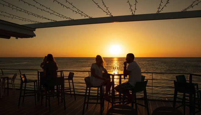 在黄昏时,游客通常会在上层甲板欣赏迷人的落日风景,拍照留念,也可以在船上的酒吧享受一杯美酒,享用美妙晚餐,可以和其他游客一同在甲板上用餐,也可以在水下观景舱享用美食,到了晚上,会点亮水下探照灯,您会见识到和白天完全不同的另一个水下世界。置身于夜晚远离海岸的海面上,任何灯光和星光的照射都会让你感到惊嘆,繁星点点的清澈星空让人对大自然的馈赠感激不已,流星滑落时,别忘记许下您的愿望,背靠“星光浴”躺椅(白天的日光浴躺椅),放松享受,用观星望远镜欣赏让人如痴如醉的深邃星空,船上有天文爱好者的船员可以帮助您找到不同的星座和行星。