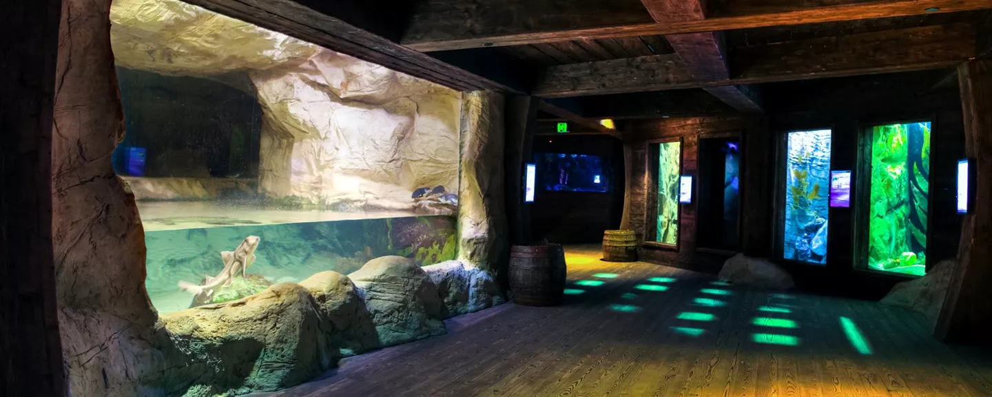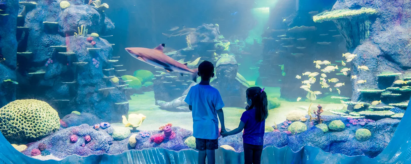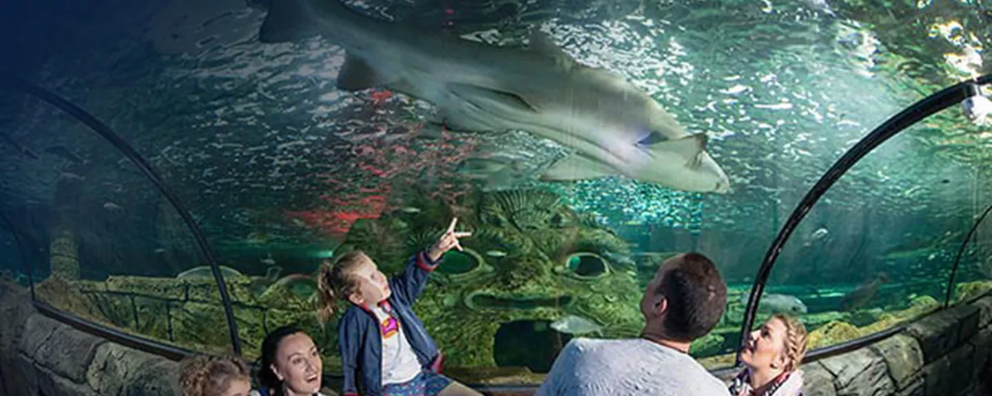 勇敢地走过世界上最大的水族箱之一,遇见灰 nurse 鲨等各种鲨鱼。深入海底,探索鲨鱼谷的深处。当穿越平行的水下隧道时,你还会遇到我们巨大的平滑魟!