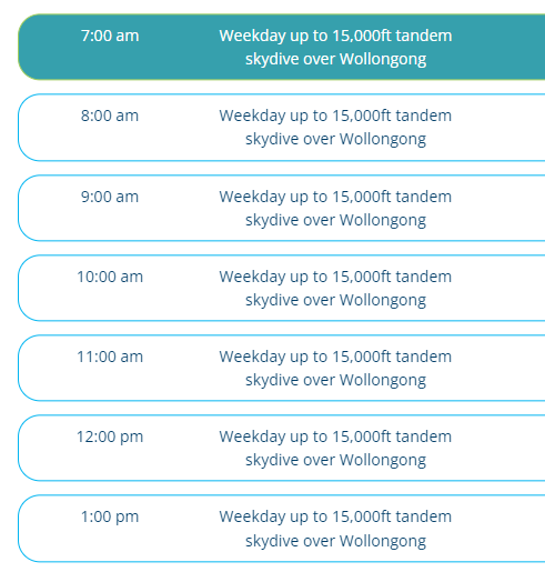 "如果你自行驾车前往跳伞区,你可以选择从早上7点开始到下午1点的场次(如下)。请在预订时做出备注,否则我们将默认为你在9点预订跳伞时段。"