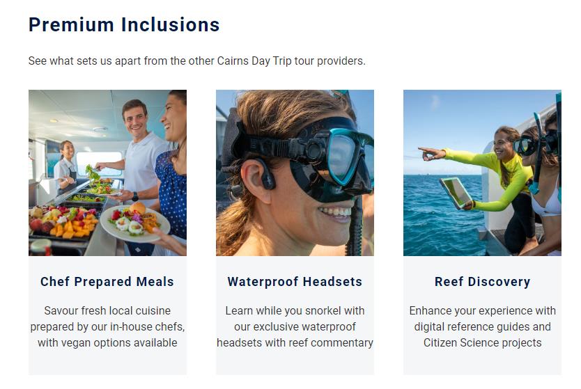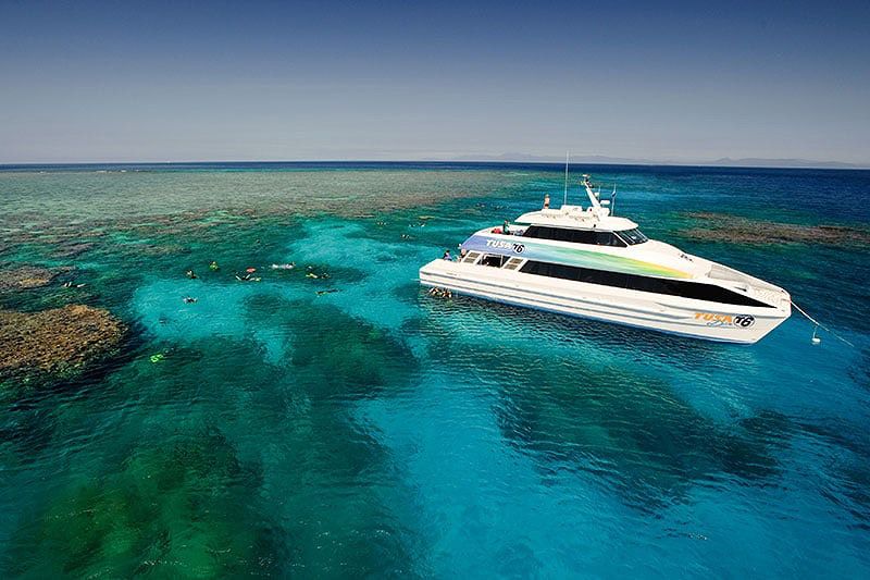 2:30 pm – 随著一天的结束,是时候告别美丽的大堡礁,回到凯恩斯,留下一生的回忆。在获得更多有关鱼类和礁岩生物的信息、以及访问大堡礁海洋公园管理局的“Reef之眼”应用程序来分享您的观察之际,请享用饮料和芝士拼盘。此外,不要忘记参与一两次的合影,纪念您令人难以置信的一天。