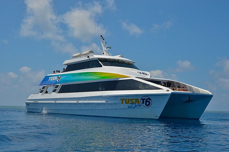 此行程深受浮潜及潜水爱好者喜爱,兔莎号游船(TUSA)专业潜水游在凯恩斯当地已营运25年,并且拥有外堡礁独特的27处潜水点,全新的兔莎TUSA号,极新颖的外观里,拥有超舒适的设备,及轻易下海潜水的设计点,为保障游客更宽敞的活动空间,及跟船员们活泼有趣的互动,乘客人数上限仅40人,每日视当天情形,精选独家16处潜水点的其中2个,让游客开心地进行水下探险,无论您想自己浮潜,或由专家船员带您一起,甚至入门深海潜水及一天可达3次的持牌潜水,绝对令您大呼过瘾,永生难忘,此为凯恩斯最专业的潜水船。