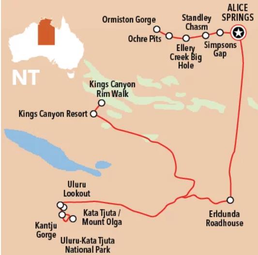 行程于爱丽丝泉(Alice Spring) 7:00am一早出发, 沿途经过 Mt Connor lookout 俗称假乌鲁鲁, 沿途观赏美丽的沙漠风光,独特的红色山脉, 在Curtin Springs停留休息用午餐及上洗手间, 客人亦可选择在艾尔斯岩机场上车Yulara (Uluru Airport) 约13:30pm迎接