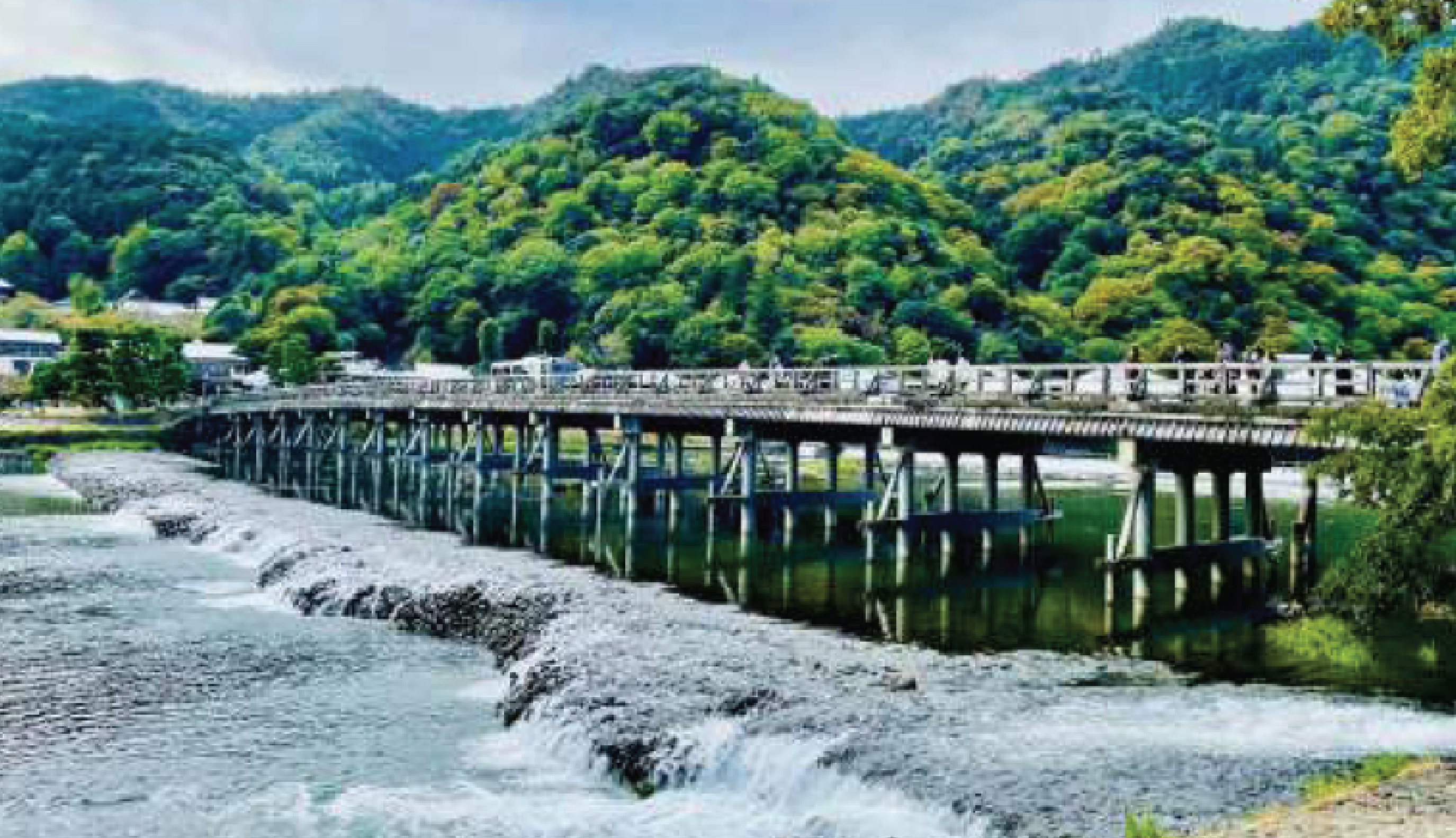 【渡月橋】附近景色宜人,青山綠水,料亭紅燈,遊人如織。春天櫻花、秋日紅葉,美景倒映在大堰川上,美不勝收。