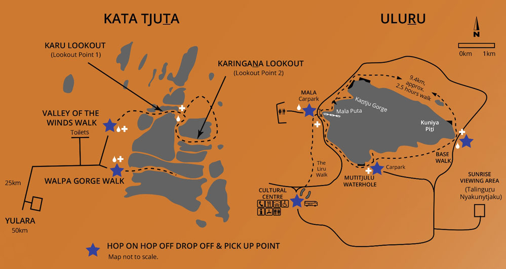 此為彈性且高效益的交通選擇,無需租車即可輕鬆探索兩大地標景點。您可自由安排自己的行程,包括觀賞日出、參加 ranger 導覽步行活動、參觀文化中心,或依個人步調完成烏魯魯環岩步道。烏魯魯 4 個主要停靠點:Mutijulu Waterhole, Kuniya Piti, Mala Carpark, Cultural Centre
