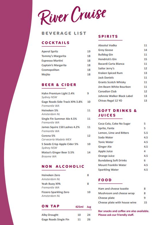 船長將於整段航程提供專業英文解說,從珀斯往返 Barrack Street Jetty,讓旅客在優雅的午後更加了解這條迷人的河流。