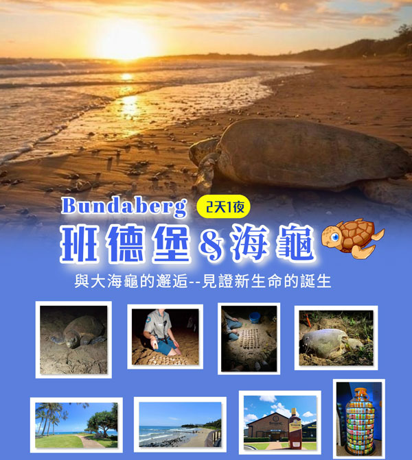 第一天 早上8:30布里斯本 出發-到達班德堡(Bundaberg) - 參觀班德堡朗姆酒廠和飲料廠 - 入住市區旅館 - 市區晚餐 - 夜晚在蒙利普斯(Mon Repos)海灘觀看海龜下蛋(18:30-23:30)