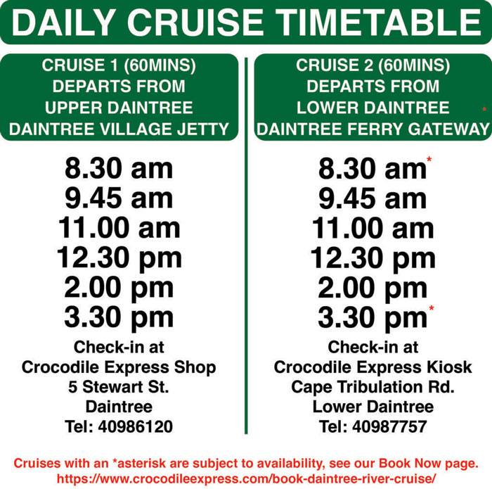 Crocodile Express Daintree River Cruises 的亮點是有80%機會在其自然棲息地中看到鹽水鱷魚。這些史前生物常常被發現曬太陽在河岸上或潛伏在水中。導遊確保乘客的安全,同時讓他們近距離觀察這些壯觀的生物。Crocodile Express遊船公司非常注重環境責任,尊重及保護丹特里雨林及其野生動物及居民.