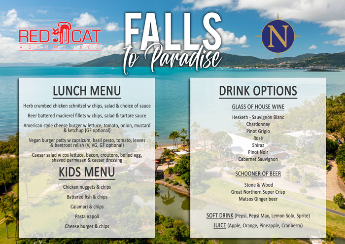 客人可以在Northerlies餐廳停留更長的時間,禮賓大巴有機會給想留久用餐喝酒的客人使用,每 45 分鐘一班從 Northerlies 出發回艾爾利海灘(Airlie Beach), 請當天與導遊確認