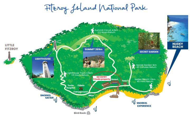 你可以享受島上森林步道等及全島各海灘區 : 自行探索祕境的天然 - "天體自然網美海灘Nude Beach” 自由登山步道:島上碼頭走到"百年燈塔"穿過登山小徑(約3.6Km-來回), 從燈塔到島上高峰(1.5Km-來回)。翡翠島Fitzory Island 環礁軟珊瑚群鮮豔種類豐富,絕對讓人流連忘返,特別是自由行和年輕旅客的首選度假聖地!