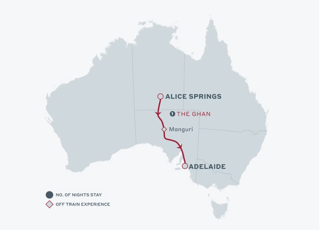 (旅客在愛麗絲泉上車後,將從第 2 晚開始過夜列車體驗,直到抵達阿德萊德