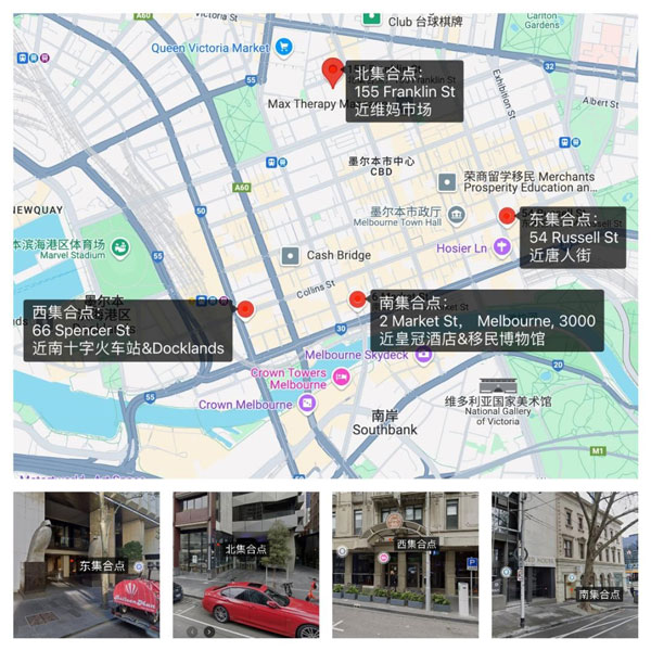 - 市區南集合點: 2 Market St, Melbourne VIC 3000, 近皇冠酒店和墨爾本移民博物館