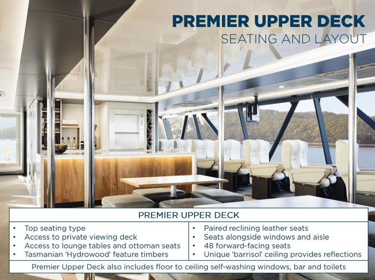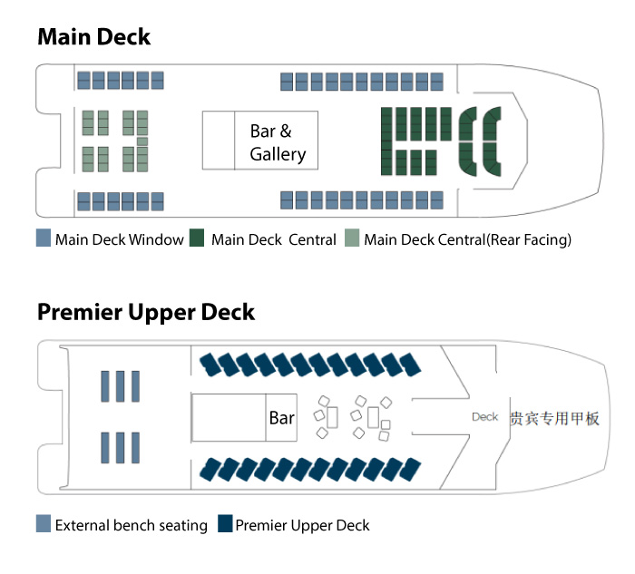 | 二層貴賓區(Premium Upper Deck) | 豐盛的冷熱自助餐,多國語音導遊服務,導遊,雙人座靠窗休閒椅, 上下午茶,貴賓區專屬陽光甲板,小點心,全程吧臺服務 |