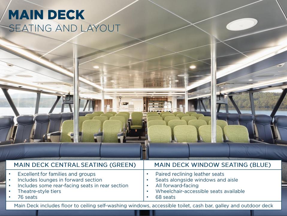 | 主賓客區靠窗位(Main Deck Window) | 美味自助餐,多國語音導遊服務,導遊雙人座靠窗休閒椅 |
