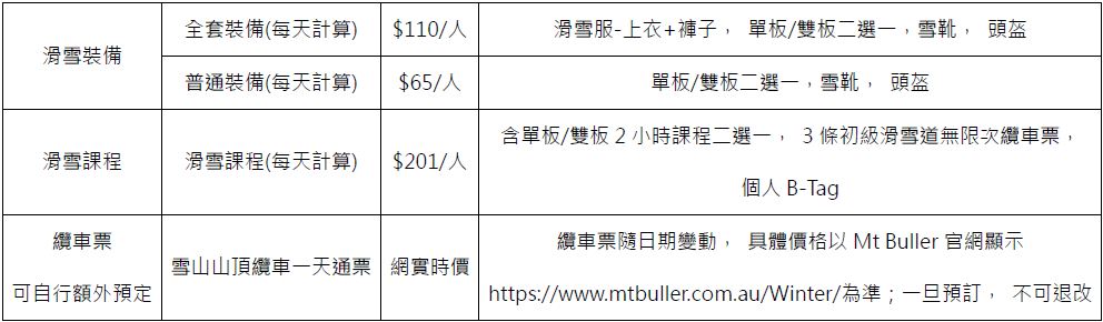 滑雪裝備(可提前租賃或當場租賃, 當場選擇Size; 注意手套+滑雪鏡為個人物品, 不提供租賃服務, 可提前自行購買或當場購買):