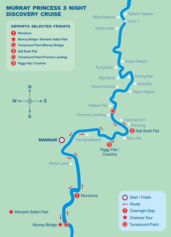 出發/抵達 郵輪於曼南姆(Mannum)的瑪麗安保留區(Mary Ann Reserve)於每週五下午4:30啟程,並於隔週星期一上午9:00返回。若您已經加訂接送或停車,您的確認信函將包括您的巴士接送、私人接送或停車詳情。