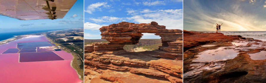 早晨前往夢幻粉紅湖(Hutt Lagoon),湖水因天然藻類色素呈現迷人粉紅色澤,隨陽光與季節變化展現不同層次的色彩,宛如天然調色盤。午餐於寧靜的卡巴里(Kalbarri)小鎮享用,午後進入壯麗的卡巴里國家公園(Kalbarri National Park),造訪著名自然之窗(Nature’s Window),紅褐色天然岩石拱門框出壯觀峽谷景色。隨後登上天空之橋(Skywalk),俯瞰墨奇森河谷(Murchison Gorge)壯麗地貌。