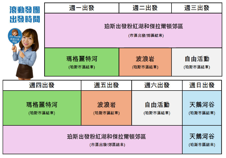 本行程為天天出發,滾動發團,旅客可依自身行程自由選擇出發日期。兩條路線可選,但是例如如果週二出發只能選擇波浪岩行程。每日運行路線如下: