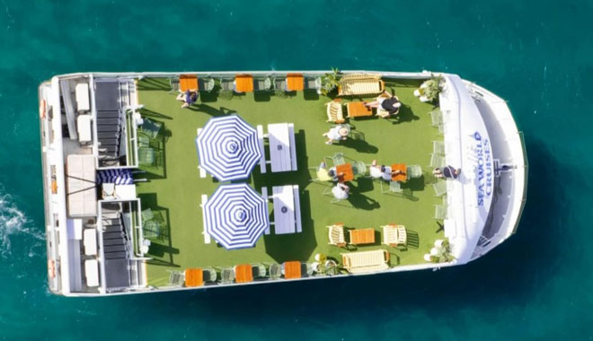 在酒吧享用清爽的飲品(自費),在寬敞的露天甲板上欣賞壯麗的景色。航行經過標誌性的區域景點,如海洋世界、海市蜃樓碼頭、迷人的五星海濱酒店等等,黃金海岸最佳水上輕奢體驗