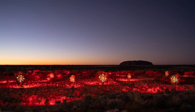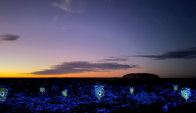 原住民藝術雷射秀:由三位 Anangu 女性藝術家創作的原住民藝術作品,透過雷射和光影技術,投影在烏魯魯和卡塔丘塔(Kata Tjuta)周圍的沙漠景觀上,展現出深厚的文化連結。