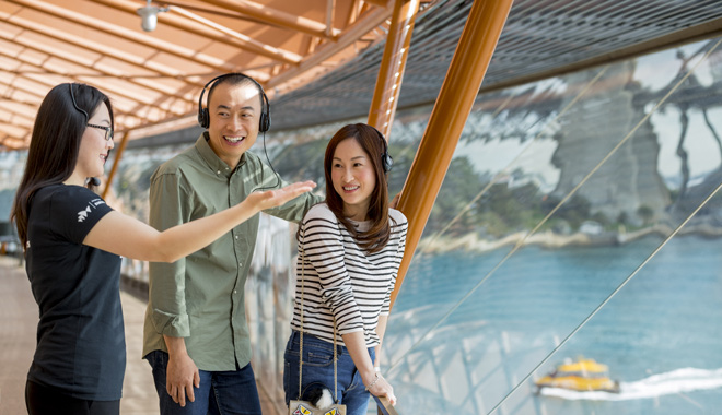 現在每天提供英語、法語、德語、西班牙語、普通話(中文)、韓語和日語的多語言導覽!以您的語言發現悉尼歌劇院的歷史! 享受一場還未公開祕密的故事、趣聞和悉尼歌劇院歷史的旅程 品嚐由House Canteen或Opera Bar製作的美味套餐,欣賞海港大橋的美景