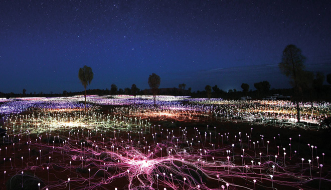 原野星光由國際著名的燈光藝術家Bruce Munro所設計的原野星光藝術裝置展,於2016年來到烏魯魯。以烏魯魯大紅石為背景,呈現了一場光的唯美藝術展。這也是Munro到目前為止最大的原野星光藝術裝置展,當夜幕降臨在澳大利亞的中心-烏魯魯,50000多個磨砂玻璃球體的燈管將在夜空中如花朵般綻放,像阿凡達的秘境,似夢幻星海,攝人心魄,美不勝收。