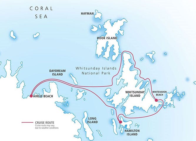 一天內前往聖靈群島著名的兩點景點 - 白天堂海灘(Whitehaven Beach)和漢密爾頓島(Hamilton Island)。 從艾爾利港出發(Port of Airlie),登上遊輪,開始一段風光旖旎、有導遊全程陪同的巡遊,駛向壯麗的白天堂海灘,悠閒地坐下來,盡情呼吸清新的海洋空氣,陶醉在聖靈群島的神奇和美麗中,讓腳丫舒展在潔白細膩的矽沙裡,盡情享受溫暖而晶瑩剔透的海水。